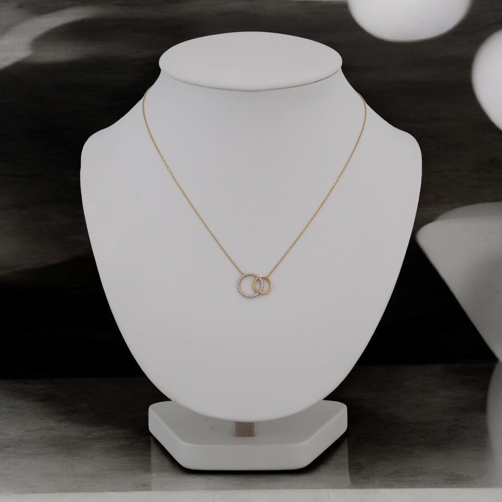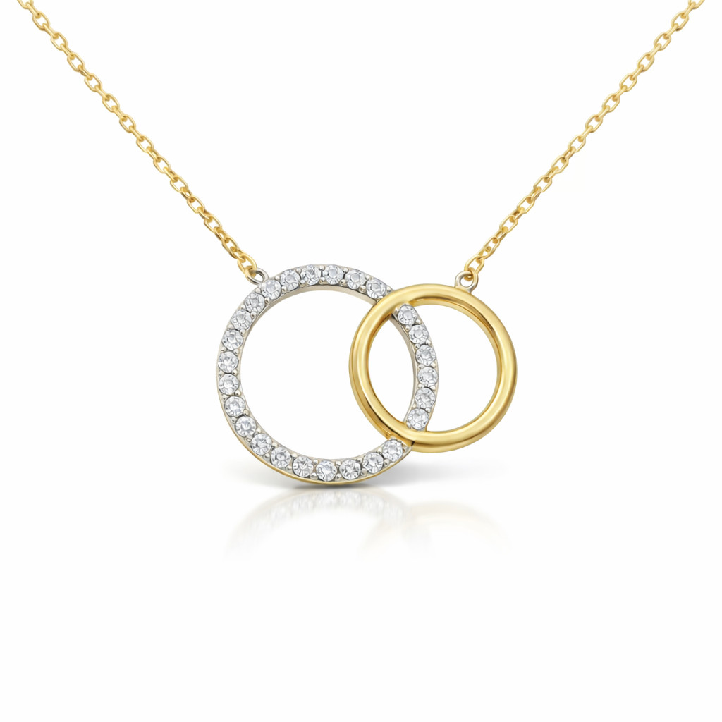 Ein Anhänger mit zwei ineinander verschlungenen Ringen, von denen eine Hälfte vollständig mit Zirkonia-Steinen besetzt ist, wodurch ein besonderer Glanz für die Trägerin entsteht.