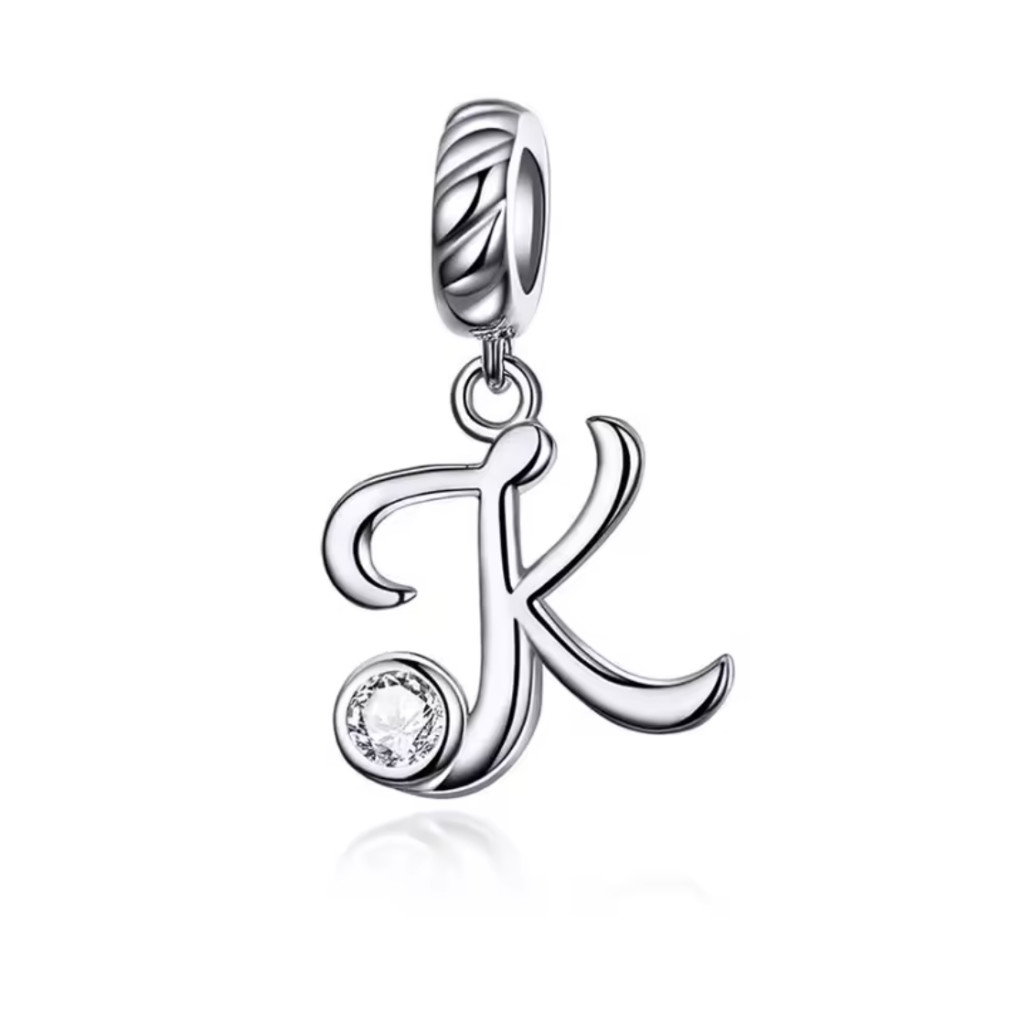 Ezüst charm, K betű cirkónium kristállyal
