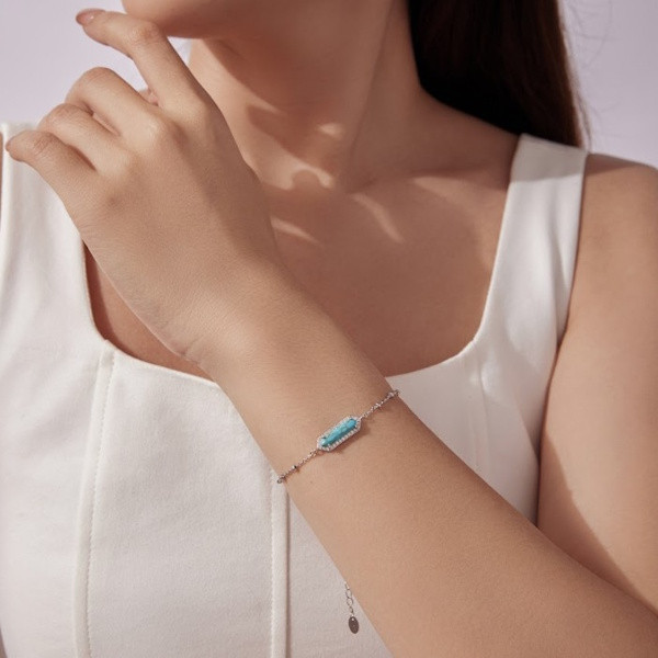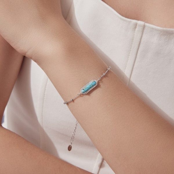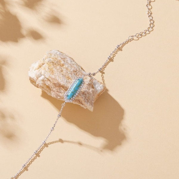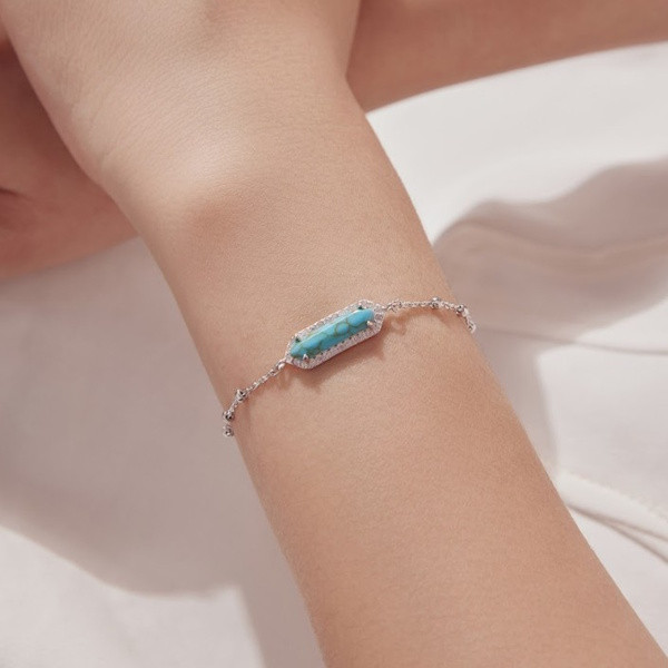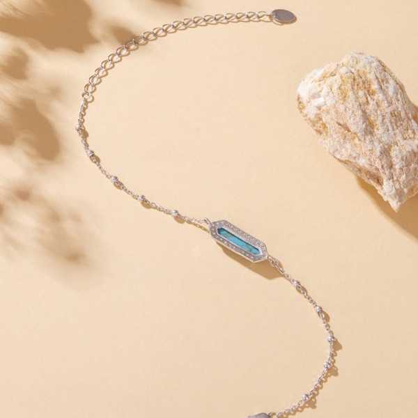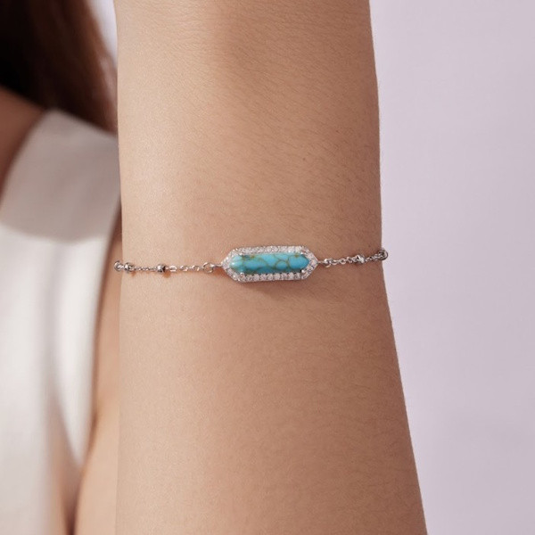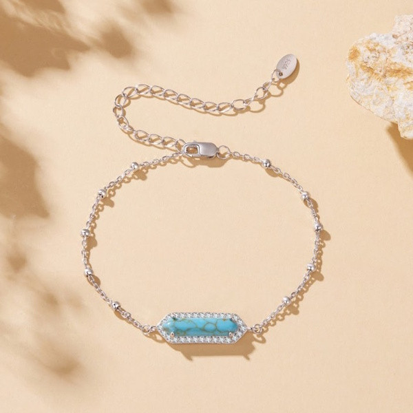 Stílusos és kifinomult, ez az ezüst karkötő a tökéletes kiegészítő, amely könnyed eleganciát kölcsönöz minden öltözetnek. A 925 sterling ezüstből készült karkötő fehérarany-bevonattal rendelkezik, amely kiemeli a szintetikus türkiz kékeszöld ragyogását. A karkötő középpontjában egy lenyűgöző hatszög alakú türkiz található, amely a harmónia és az egyensúly szimbóluma. Az ókori kultúrák szerint a hatszög az univerzum tökéletességét jelképezi, így viselése nemcsak stílusos, hanem spirituális élményt is nyújt.