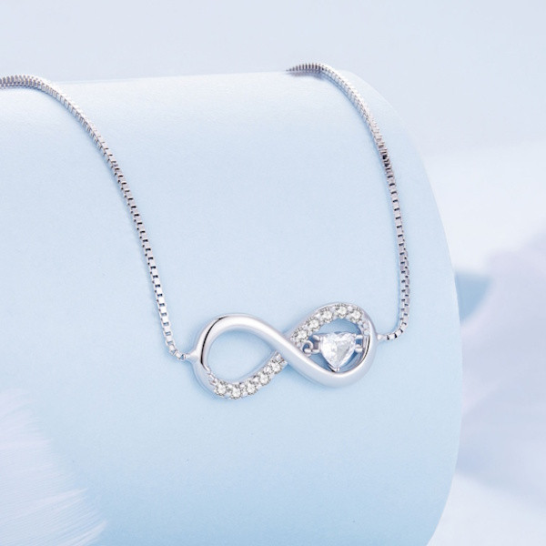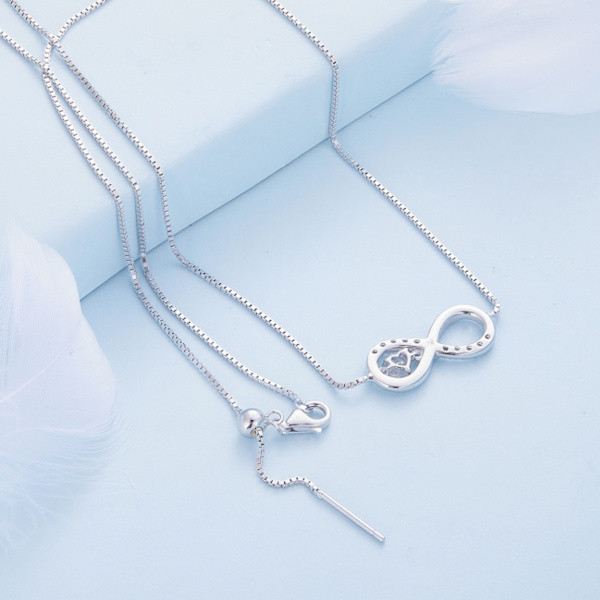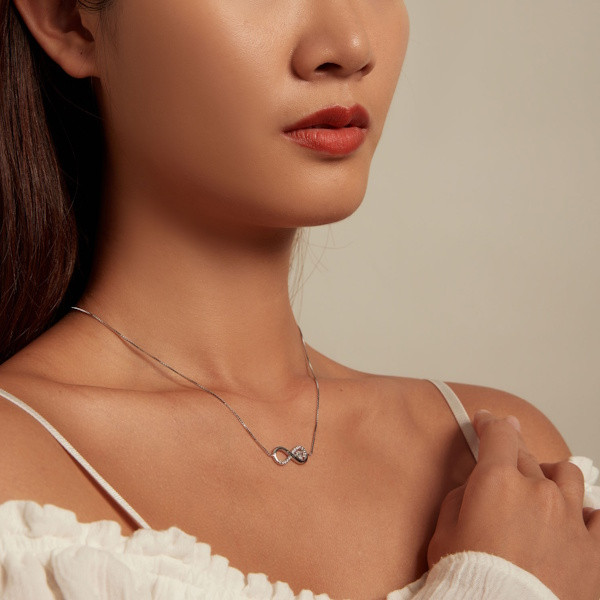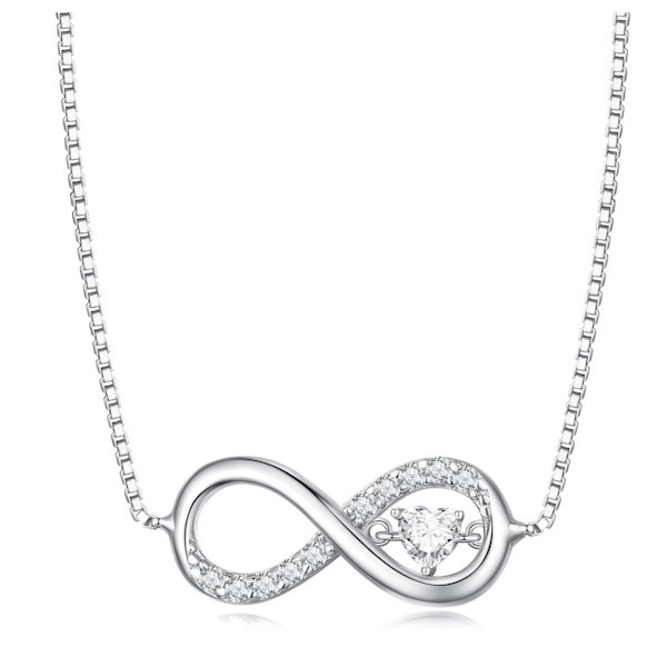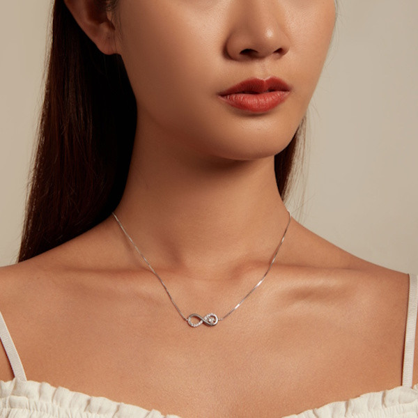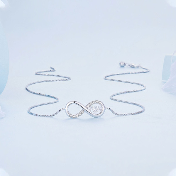 Ez a lenyűgöző, 925 sterling ezüstből készült női nyaklánc tökéletes választás minden alkalomra. A platinabevonat elegáns fényt kölcsönöz a láncnak, míg a csillogó cirkóniumkristályokkal díszített végtelen jel szimbolikus jelentéssel bír. Az örökkévalóság és a határtalan lehetőségek szimbólumaként a végtelen jel a különleges kapcsolatok, vagy személyes célok kifejezésére szolgál. A 45 cm hosszú lánc és a 0.9 × 2.3 cm-es medál tökéletesen illeszkedik a nyakad ívéhez, kiemelve a nőiességedet. Könnyed, mindössze 2.7 grammos súlyával kényelmes viselet egész nap. Ajándékba is ideális, hiszen egy ilyen jelentőségteljes motívummal díszített ékszer mindig személyes és maradandó üzenetet hordoz. Lepd meg szeretteidet ezzel a különleges darabbal, amely biztosan elnyeri tetszésüket.