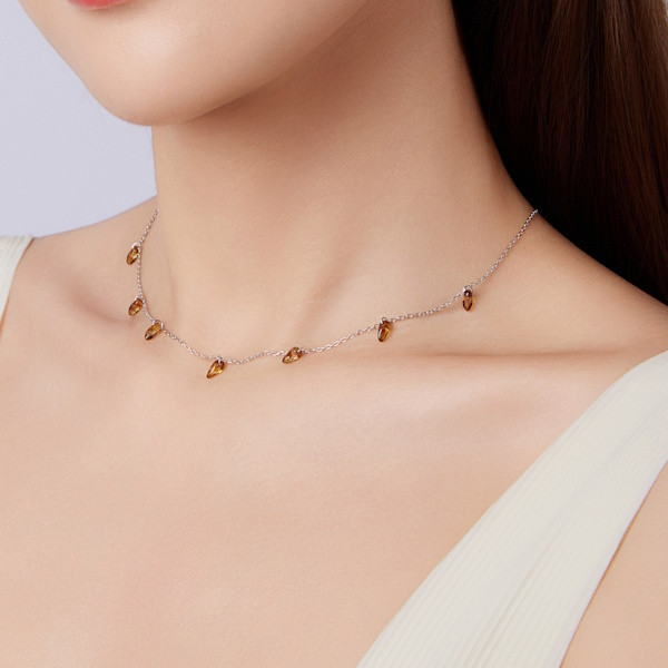 Ez az elegáns ezüst nyaklánc finom borostyánszínű üveggyöngyökkel díszítve igazi különlegesség. A 925 sterling ezüstből készült láncot fehérarany-bevonat fedi, ami nemcsak a csillogását emeli ki, hanem tartósságát is növeli. A csepp alakú gyöngyök különleges, áttetsző hatást kölcsönöznek neki, így minden alkalomra tökéletes választás.