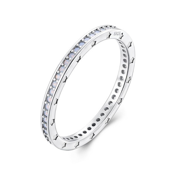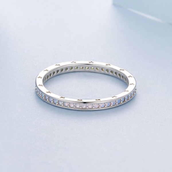 Ezüstből készült női gyűrű fehérarany-bevonattal és opállal díszítve. Szélessége 0.18 cm, súlya 1 g.
