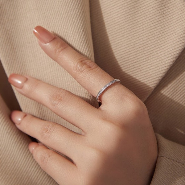 Ezüstből készült női gyűrű fehérarany-bevonattal és opállal díszítve. Szélessége 0.18 cm, súlya 1 g.
