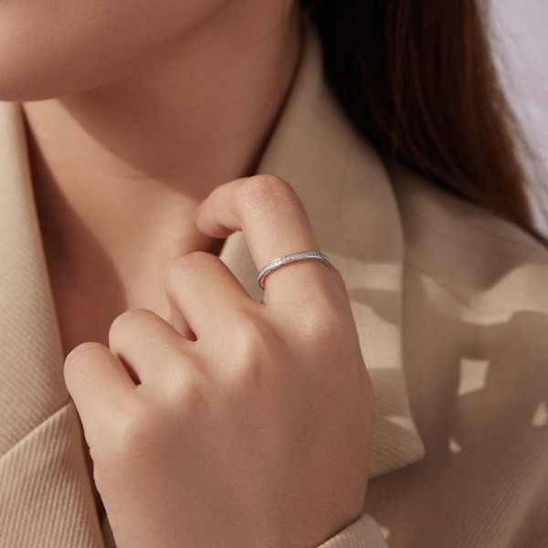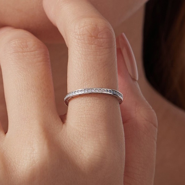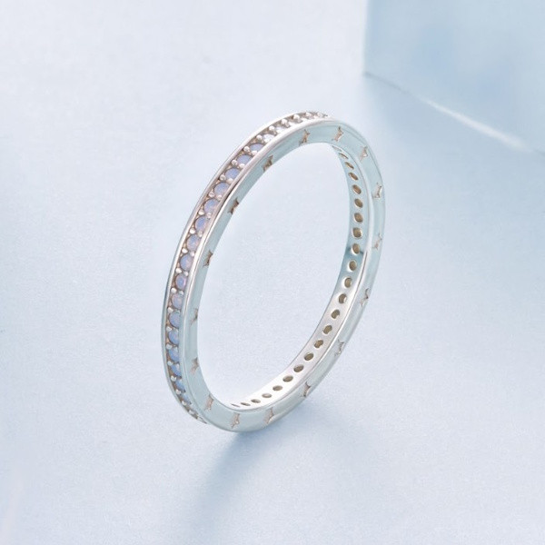 Ezüstből készült női gyűrű fehérarany-bevonattal és opállal díszítve. Szélessége 0.18 cm, súlya 1 g.