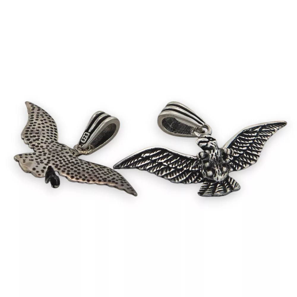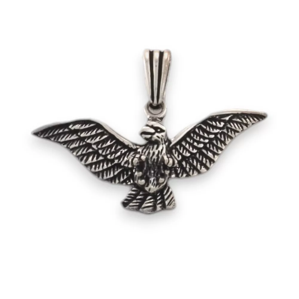 Ez a sterling ezüst sas medál egy különleges, részletgazdag ékszer, amely erőt, szabadságot és határozottságot sugároz. A sas kitárt szárnyainak finom kidolgozása aprólékos kézműves munkát tükröz, ahol a tollak textúrája és a tekintélyt parancsoló fej formája tökéletes összhangban jelenik meg. Az oxidált felület kiemeli a részleteket, és antik hatást kölcsönöz a medálnak, amely így még karakteresebb megjelenést biztosít.