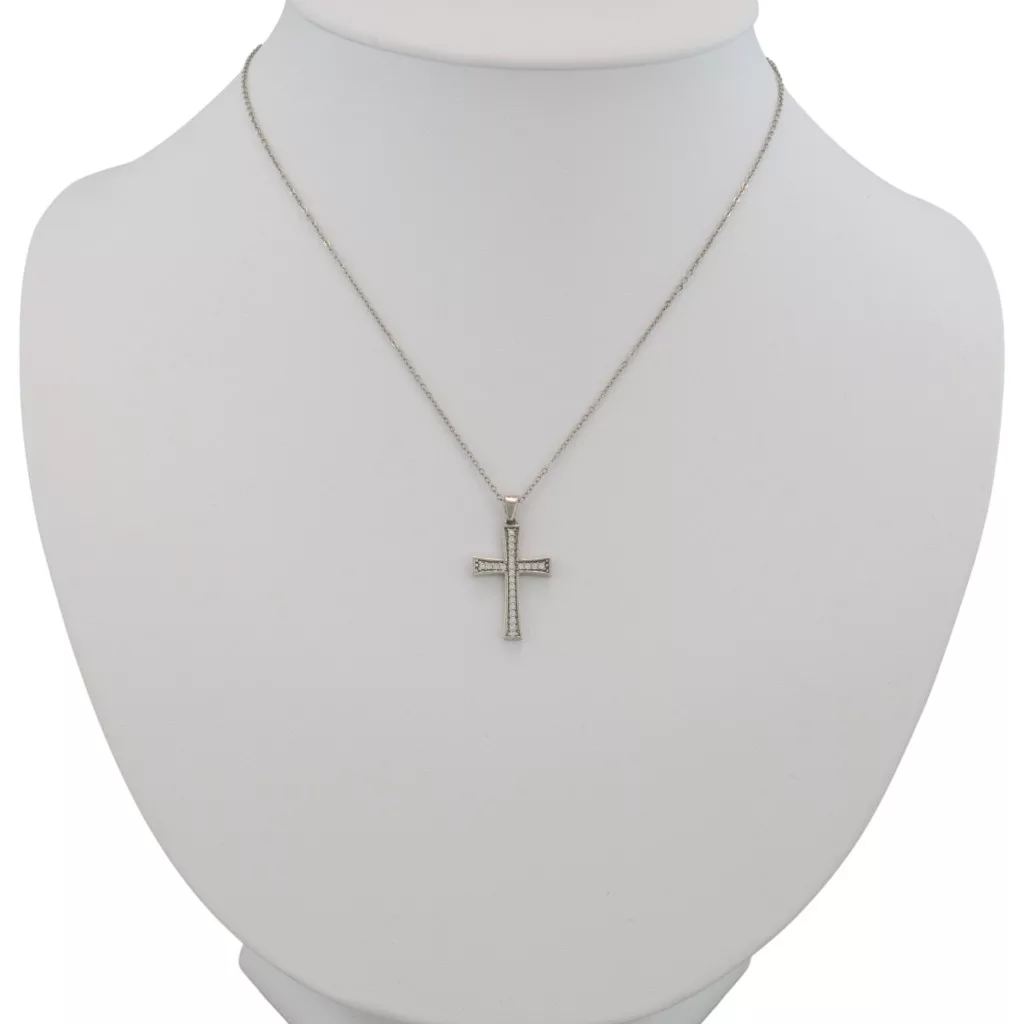 A felületét csillogó, apró kövekkel díszítették, amelyek elegánsan kiemelik a kereszt vonalait, és időtálló fényt kölcsönöznek az ékszernek.