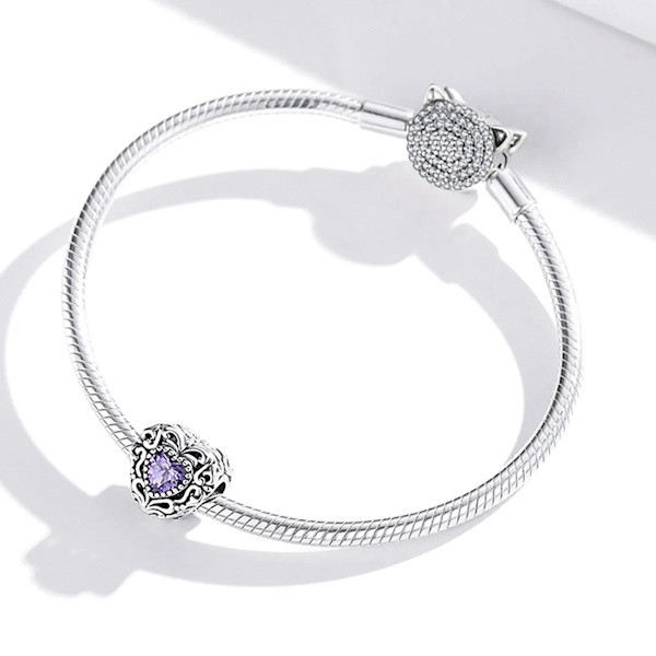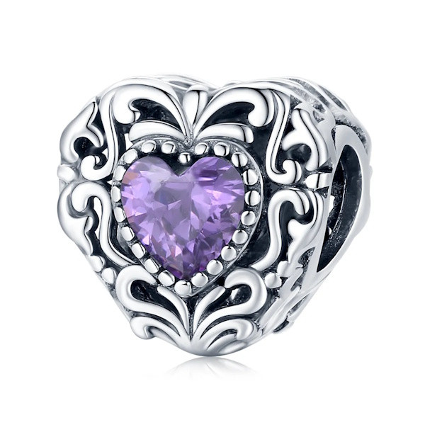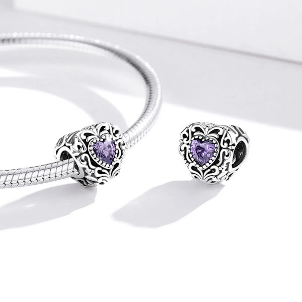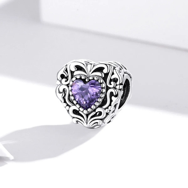Fedezd fel a romantika és a vintage elegancia találkozását ezzel a gyönyörű 925 sterling ezüst charmmal! A 925 sterling ezüstből készült, oxidált felületű charmot egy lila cirkóniumkristály teszi igazán különlegessé, amely a szív alak közepén helyezkedik el. A szív motívum az ősidők óta a szeretet és az összetartozás szimbóluma, így tökéletes választás lehet szeretteid megajándékozására, legyen szó bármilyen különleges alkalomról.