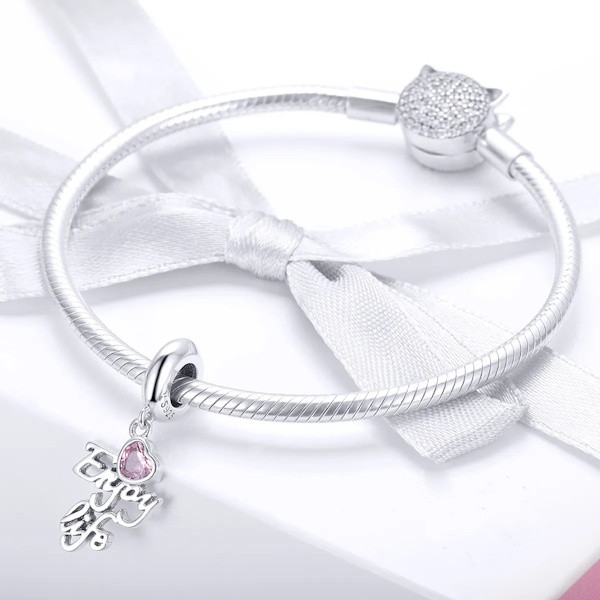 Stílusos és elegáns 925 sterling ezüst charm, amely tökéletes kiegészítője lehet bármely karkötőnek vagy nyakláncnak. A 925 sterling ezüstből készült charmot cirkóniumkristályok díszítik, amelyek ragyogó fényt kölcsönöznek neki. A charm közepén egy gyönyörű szív motívum található, amely az univerzális szeretet és összetartozás jelképét hordozza. A charmra gravírozott „Enjoy life” felirat emlékeztet arra, hogy minden napot érdemes megélni a maga teljességében.