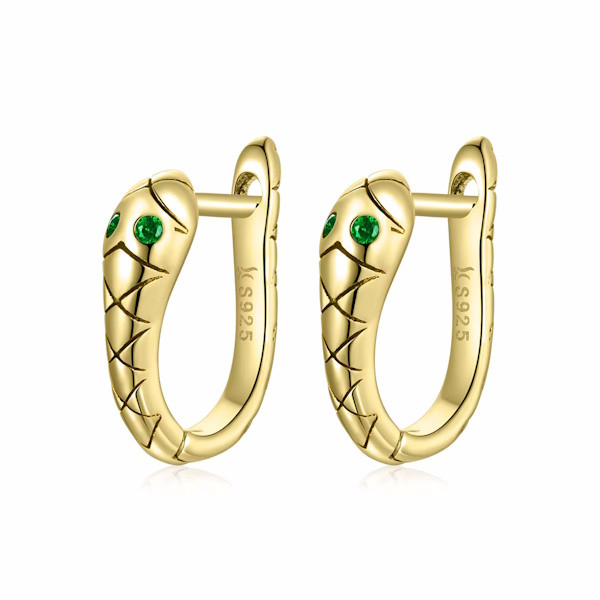 Fedezd fel az elegancia és a misztikum tökéletes kombinációját ezzel az aranyszínű, kígyó alakú ezüst fülbevalóval! A 925 sterling ezüst alapra felvitt aranybevonat és a ragyogó zöld cirkóniumkristály káprázatos látványt nyújt. A kígyó motívum már ősidők óta a megújulás és a bölcsesség szimbóluma, így ezzel a fülbevalóval nemcsak egy stílusos kiegészítőt, hanem mélyebb jelentést is viselhetsz.