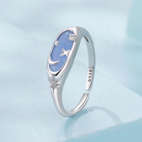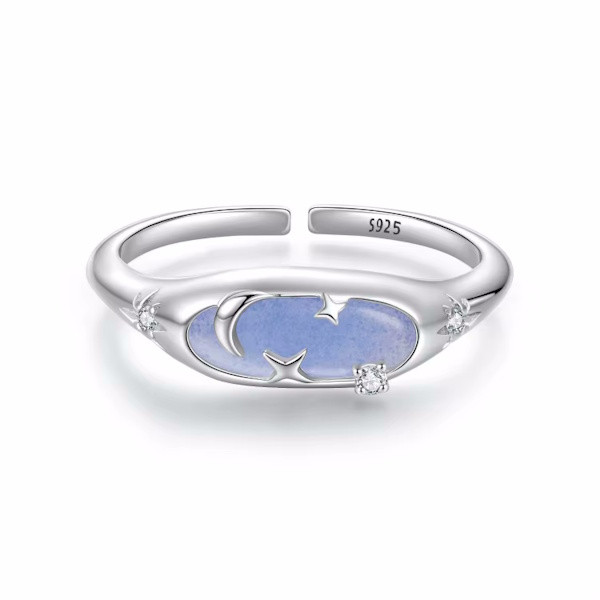 Ezüstből készült, állítóható méretű, foszforeszkáló női gyűrű fehérarany-bevonattal. Szélessége 0.16-0.6 cm, súlya 1.9 g.