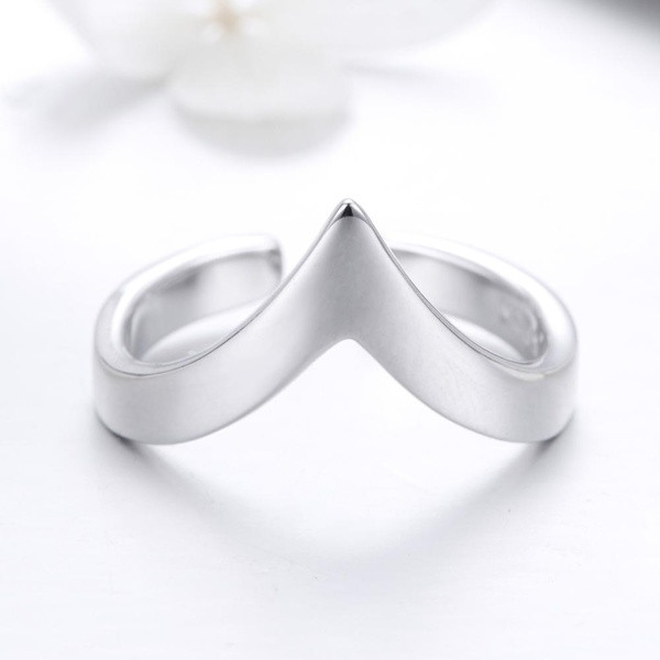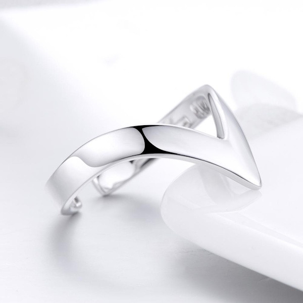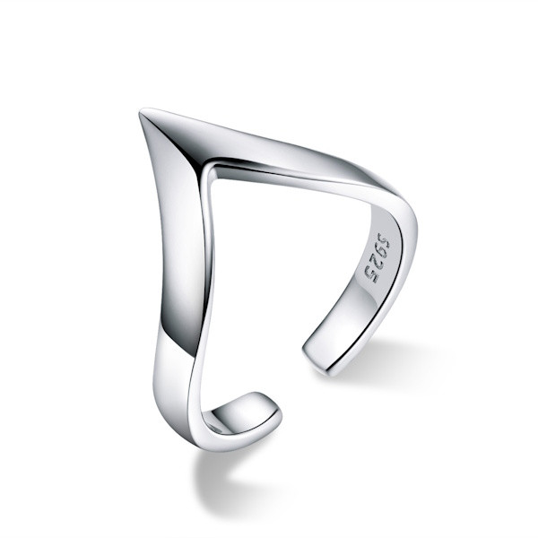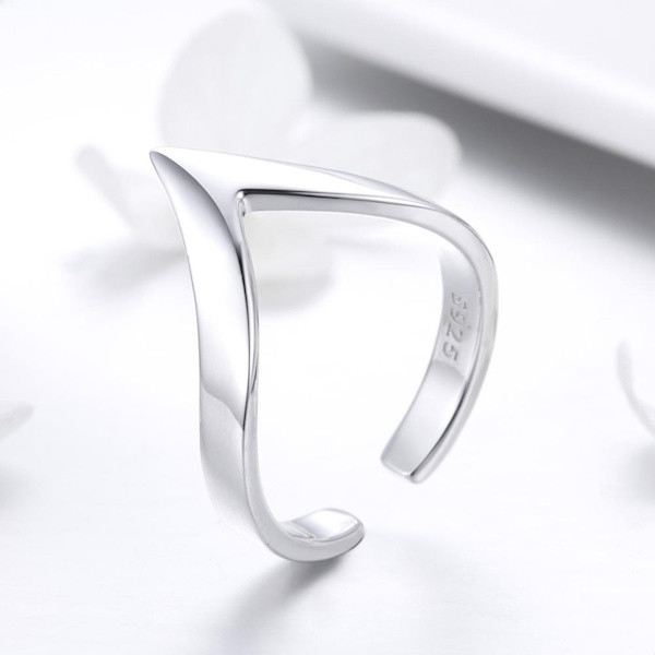 Ezüstből készült állítható méretű, modern vonalú női gyűrű platinabevonattal. Szélessége 0.3 cm, magassága 1.4 cm, Súlya 3 g.