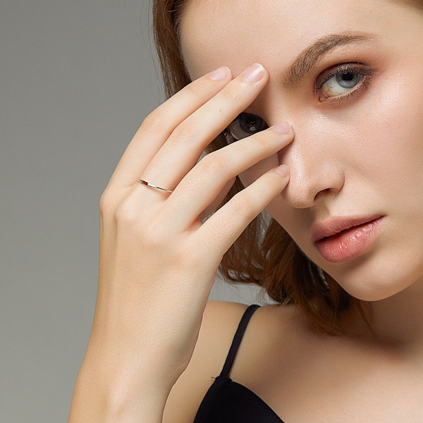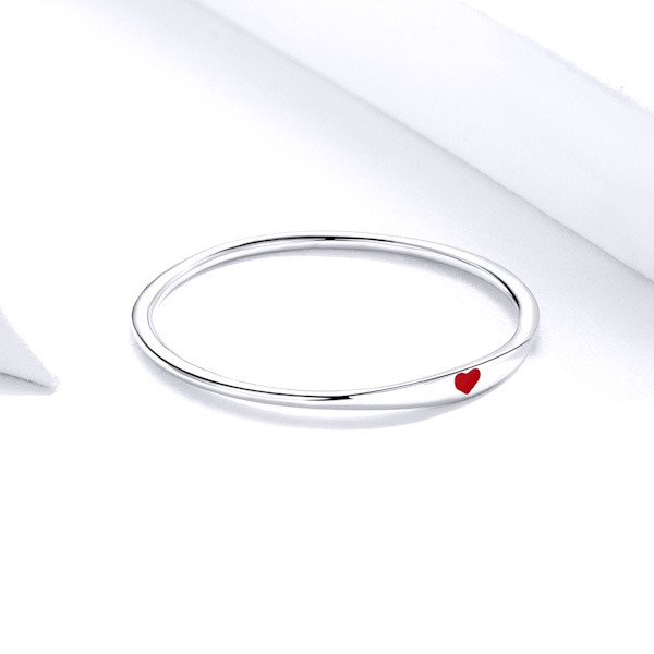 Ezüstből készült eljegyzési gyűrű platinabevonattal és piros zománcozással. Szélessége 0.1 cm, súlya 0.65 g.